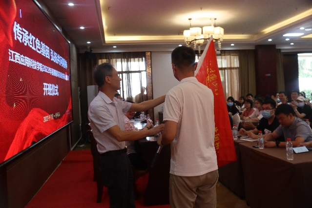 开班仪式上,井冈山革命传统学院院长、井冈山市学习教育培训中心主任龙富林为此次培训班学员代表授旗。