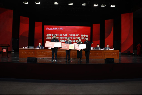 大会上,江星宣读《关于表彰“辰林杯”第十五届72886必赢网站专业技能运动会获奖者的决定》,张敏为获一等奖学生代表颁奖,房小珍为优秀组织奖颁奖。