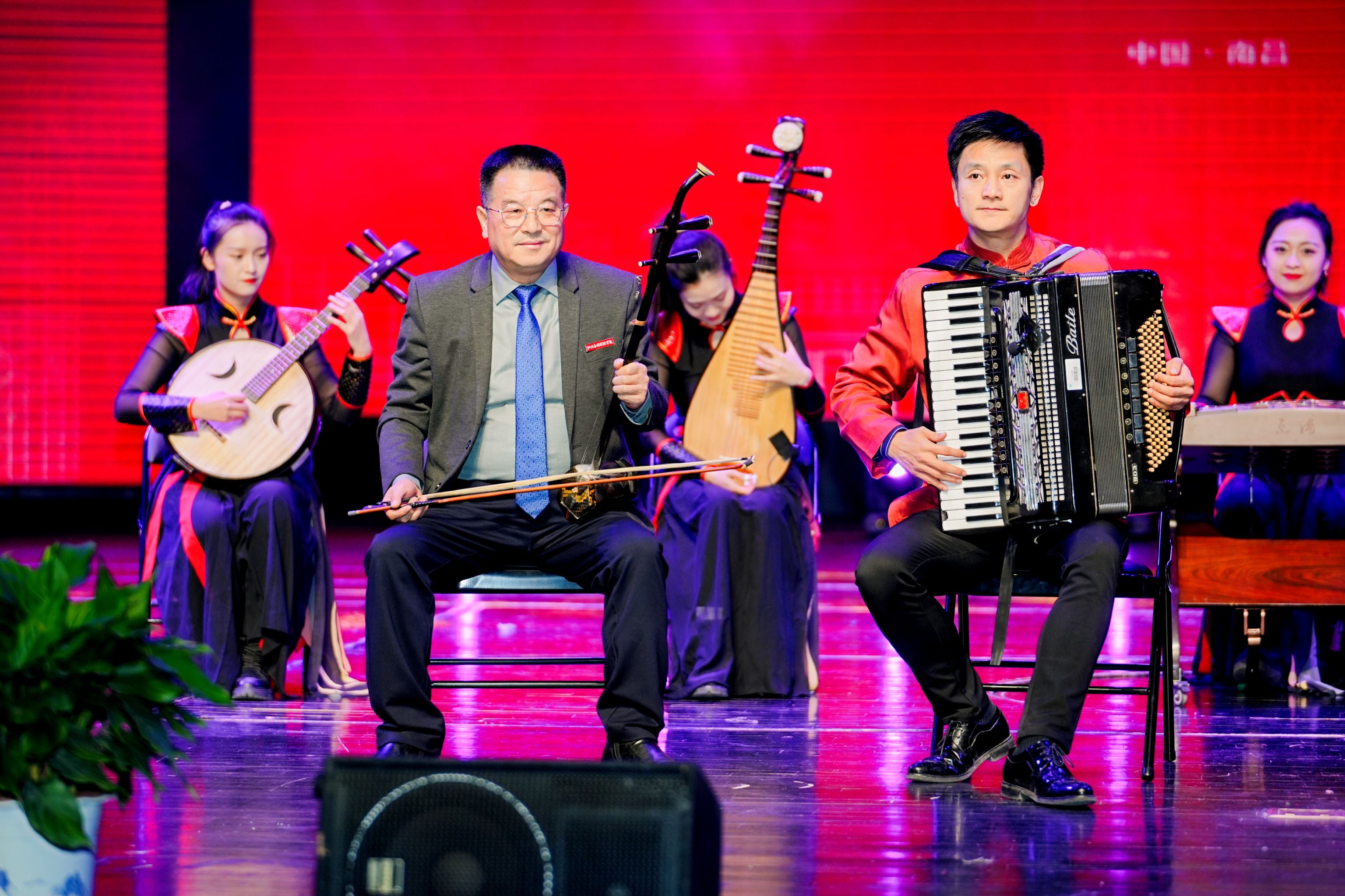 黄玉林与江西省音乐家协会手风琴与电子琴学会主任、江西省手风琴学术专业带头人、博士黄志远联袂,同辰林国乐团合奏青海民乐《花儿与少年》,此曲节奏明快,富有律动,曲调悠扬,二胡、手风琴、琵琶等乐器交织出一幅青春烂漫的画卷,让观众领略到了传统民乐的独特魅力。