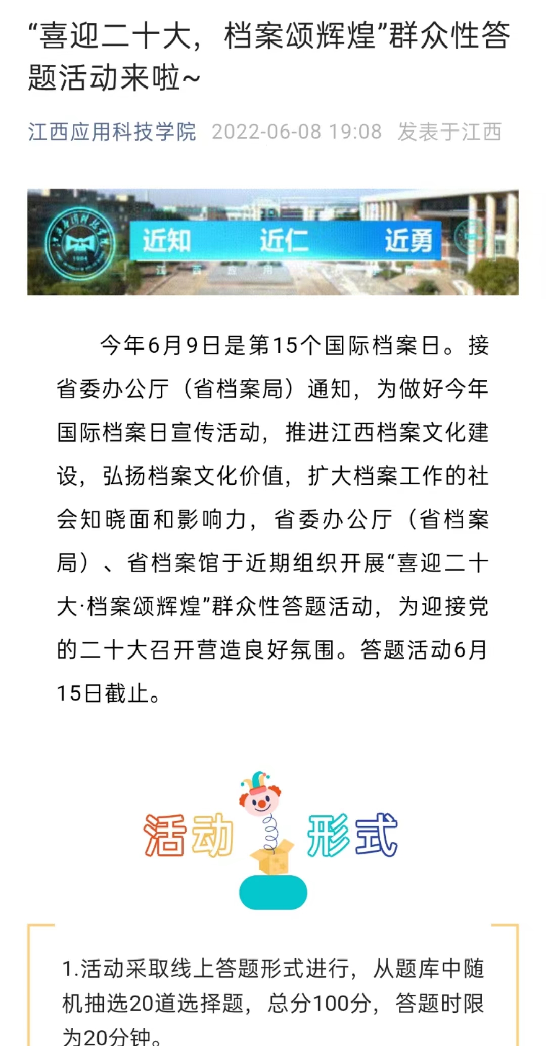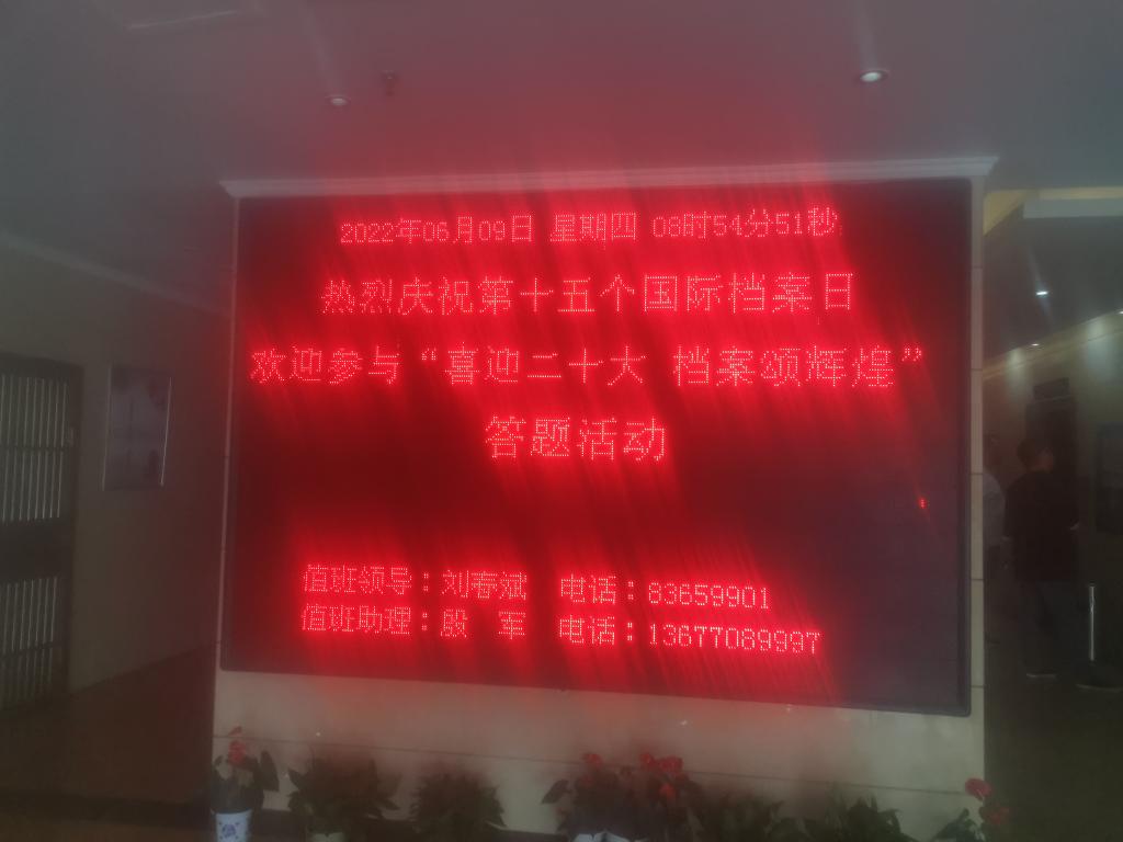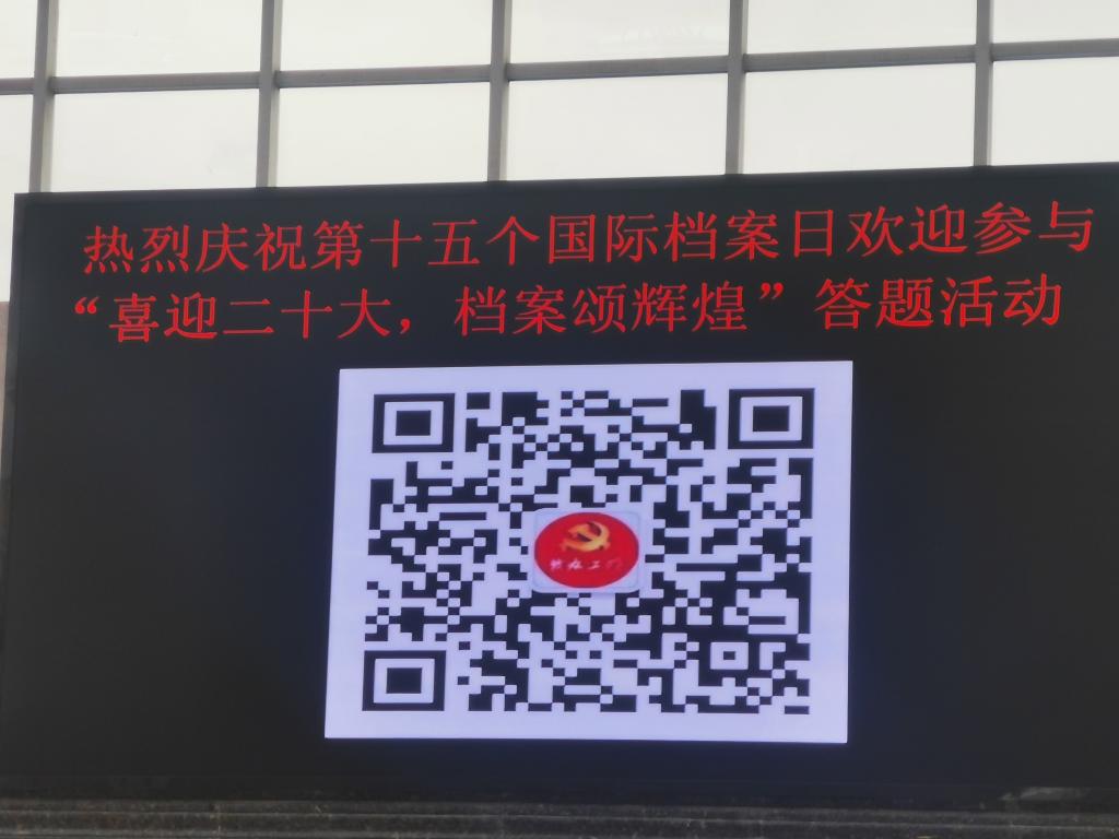 6月9日,校内所有电子信息平台都发布了“热烈庆祝第十五个国际档案日 欢迎参与喜迎二十大 档案颂辉煌答题活动”的标语。校园里充满了节日的气氛。