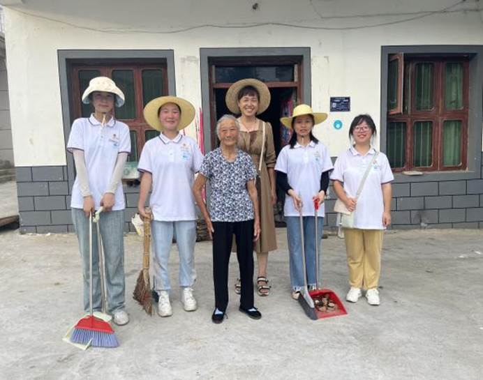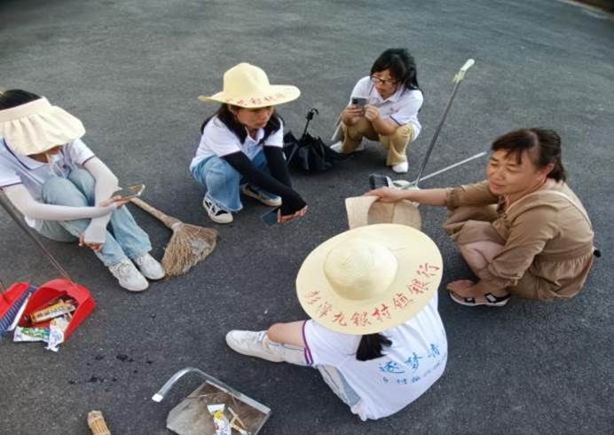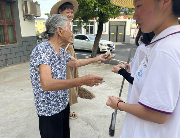 下午,成员们跟着居委的陈阿姨沿着村里的马路清除鸡粪、打扫灰尘和落叶等。打扫完小广场后,阿姨请我们吃雪糕,降温解暑。阿姨说:“我已经舍不得你们走了,想你们了怎么办?”其实,我们也很不舍,这里的村民带我们都很好。队长说:“以后想我们了,我会替我们成员过来看看你们。”朴素的言语下饱含着温情,这是幸福的言语。