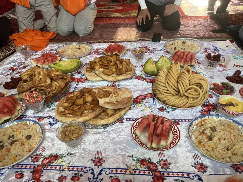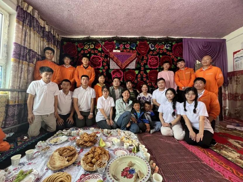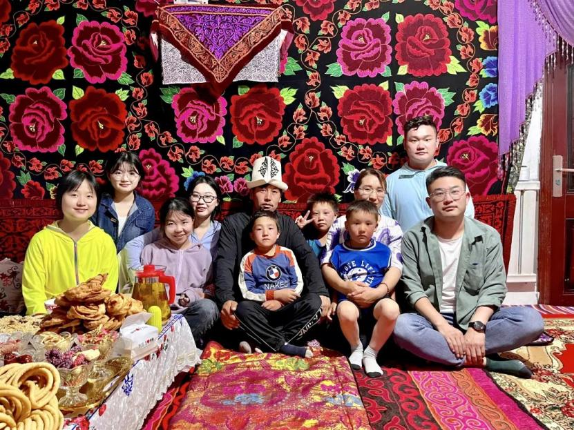 走进抵边村,实践队员们惊叹古尔邦节时的盛情招待,深入骨髓彰显文明的见面礼仪。近距离走进柯尔克孜族的民族传统文化,和村庄牧民一同劳作,一同欢度节日,共同围坐桌前,学习少数民族学习语言,虽然彼此间语言不通,但乡亲们烤羊肉、倒奶茶、端肉汤、摆各种琳琅满目的糕点。感受到各民族像石榴籽一样紧紧相拥,紧紧抱在一起的民族情、爱国情,让整个活动处处充满了欢声笑语。