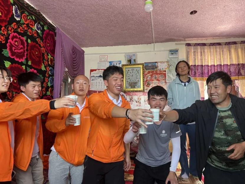 牧民玉苏普艾力·阿不都热西提与实践队队员们举杯共饮,他表示,真的很感谢中国共产党的帮助,现在的生活得到了很大改善,以后也会一直欢迎队员们过来。