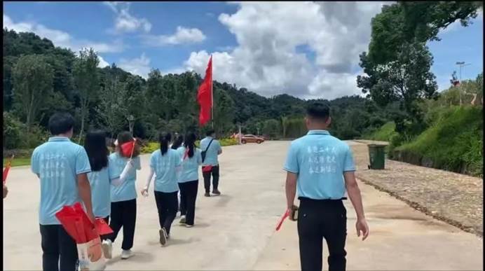 教育学院小甘露党史学习教育实践队一行14人经过一个多小时的车程,抵达于都县祁禄山镇金沙村,大家集结于祁禄山镇登贤驿站红军长征小道集结广场“登贤一九三四”雕塑前,在这里,队员们在团总支书记张伟健带领下,了解了红军长征小道的相关历史及“红军小镇”相关的党史及红色故事。随后,队员代表从团总支书记手中接过象征着荣誉和使命的旗帜,列队踏上登贤1934段红军长征小道,沿着蜿蜒的山路前行,实地体验和感悟红军长征的艰辛与豪迈,重温红军长征的峥嵘岁月。