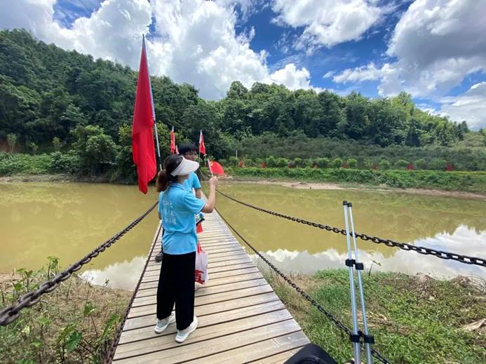 “战士们”踏上红军长征步道的第一站,就是金沙桥。金沙桥是因金沙村而得名,桥下是一条宽几米的河,时过境迁,水流量早已今非昔比。当年红军由此地驾桥渡河而过,边走边调整队形,据当地老乡讲,部队走了三天三夜,大部分战士都背着棉被、枪和斗笠,衣衫褴褛,但面容坚毅,精气神十分好。如今,乡亲们为了方便群众通行,用木头搭建了一座错落别致的农村木桥,在“总司令”的带领下,大家唱着气势磅礴的《团结就是力量》顺利过桥,想象着脚下就是湍流的河水,大家过桥时也有了当年红军的精气神。