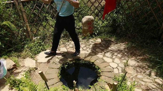 过了老鹰山,就是翻过了山顶,前面便是一段下坡路,刚转过一片荷花池就遇到了路边的古井。据传,当年红军驻扎这里时,在此就地挖井取水,88年来古井一直保留到现在,抿一口井水清洌甘甜。这么多年过去了,为了纪念当年挖井的红军战士,乡亲们在这里立碑刻字题“思源井”,这口井也成为了历史的见证者,提醒着大家要饮水思源,牢记现如今美好生活的来之不易。知道了这个渊源,队伍中的不少“战士”纷纷停下来,饮一瓢思源井水,忆一段革命历史。