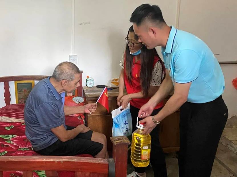 实践队一行人先后到思源社区十户特殊老人家中进行走访慰问,他们当中有生活可以自理的,也有卧床的,甚至还有头脑已经不太清楚的老人,吴书记跟队员们细心沟通了与老人相处的注意事项,随后实践队一行为他们送去大米、食用油等生活所需物资。实践队员们陪老人聊天谈心,送去温暖,了解他们的身体情况和生活状况,用朴实而真诚的行动表达着对老人们的关爱,送上了温暖。慰问的老人群体中,有三位老党员,张书记一行人详细询问党员们的身体状况和生活情况,与他们共同追忆峥嵘岁月,重温党的百年历程。