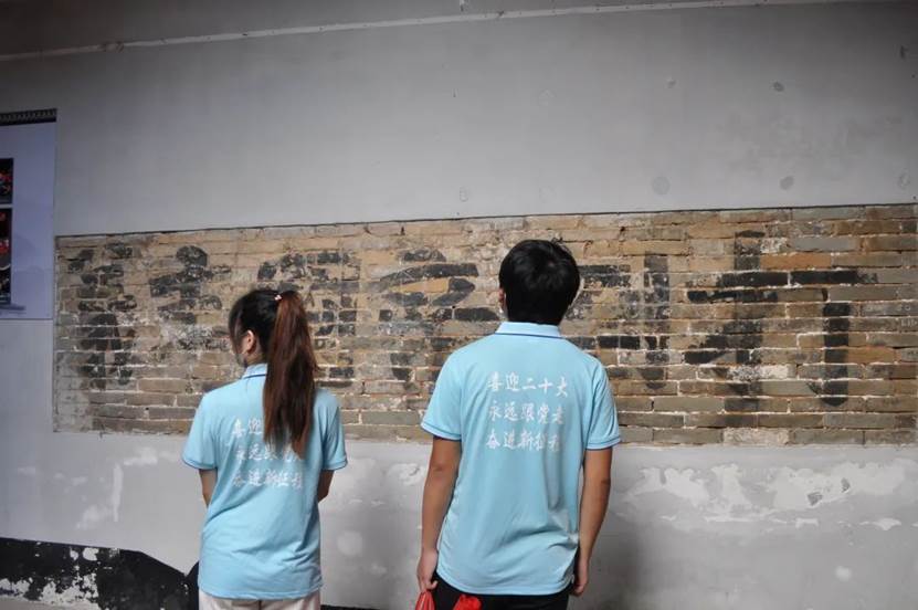 实践队员们进入到旧址内认真学习和了解其背后的深远历史,大家认真听、仔细看、用心记,在珍贵图片资料前驻足,在历史场景中思索,感受先烈们英勇不屈的革命斗志和大无畏的革命精神,重温党的光辉历史。从这些众多的标语中,大家仿佛又回到了当年那段血与火的峥嵘岁月,无不为当年红军战士展现出的一片初心、英勇无畏的革命精神所动容。队员们注意到,在大厅右侧墙壁上保留着的一行“打倒帝国主义”刚劲有力的大字,虽然岁月使其斑驳,但仍然使在场的每一位队员追忆起当年峥嵘革命岁月,深刻感受到革命先辈们坚定的革命信念和伟大的斗争精神。