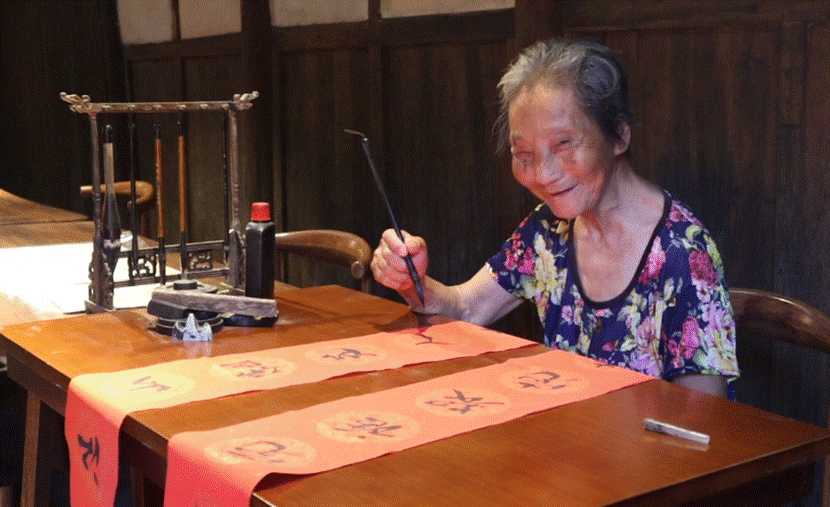 向我们展示毛笔字的这位奶奶笑呵呵地说道:“现在写毛笔不行了,年轻手有力气,还能写写,现在老了握笔都吃力了。你们现在还都年轻,都还有力气,都还能做有用的事。”随后,朝着我们的镜头露出了开怀的笑容。