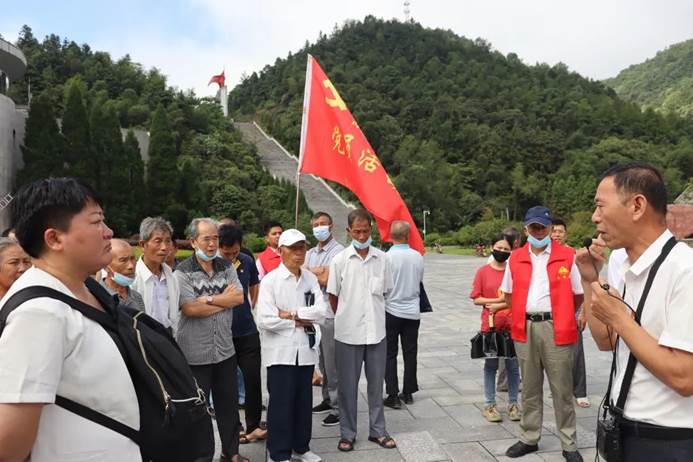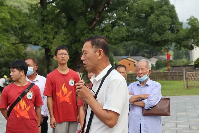 抵达目的地后,三湾改编纪念馆志愿讲解员刘老师为我们介绍实践队队员和党员干部介绍了三湾改编纪念碑,党徽,以及纪念馆旁三棵大树的故事。