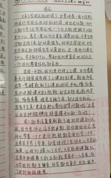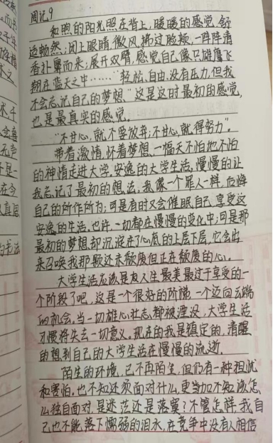 为切实从课堂以外的各方面来帮助学生认识自我,提升自我,全面发展。坚持立德树人,强化以人为本,引导和鼓励学生积极参与校内外各类实践活动,促进大学生思想政治素质、社会责任感、创新精神、实践能力等全面发展。校第二课堂发布了写周记的活动。
