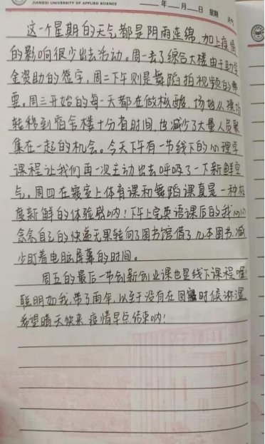 活动发布后由各分院组织各班级进行,每周五由分院收齐并检查后下发。疫情让我们不能出行,却不能阻止我们奔向更好的自己,在应科校园里,亦有万千美好的事物可以记录,在保证疫情防控的同时,大家也能在生活中画下浓墨重彩的一笔。