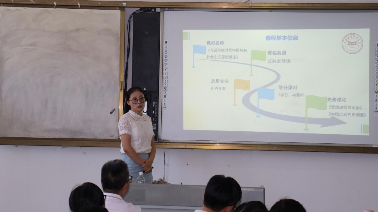 随后,课改教师汪泽民老师就《习近平新时代中国特色社会主义思想概论》这门课程,介绍了相关的课程改革要求,从课程基本信息、教材内容、学情分析、教学思想与理念、教学方法与手段、考核方式等方面详细展开说明。特别是针对教学思想与理念提出了OBE+“12345”理念,即为一条主线,两种途径,三个课堂,四对关系,五大注重。