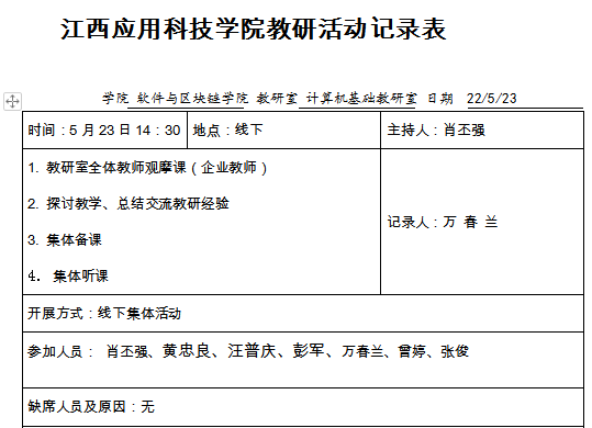计算机基础教研室于2022年5月23日在线上召开了本学期的第七次教研室活动。本次活动的主题是1、教研室全体教师观摩课(主要以企业教师为主),2、探讨教学、总结交流教研经验,3、集体备课,4、集体听课。参加人员主要包括计算机基础教研室肖丕强、张俊、万春兰、曾婷老师,还邀请了黄忠良副教授、汪普庆副教授、彭军主任。计算机基础教研室主任肖丕强主持召开本次教研活动。计算机基础教研室全体老师到会无缺席人员。