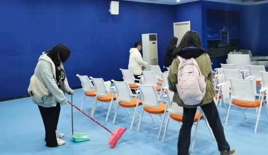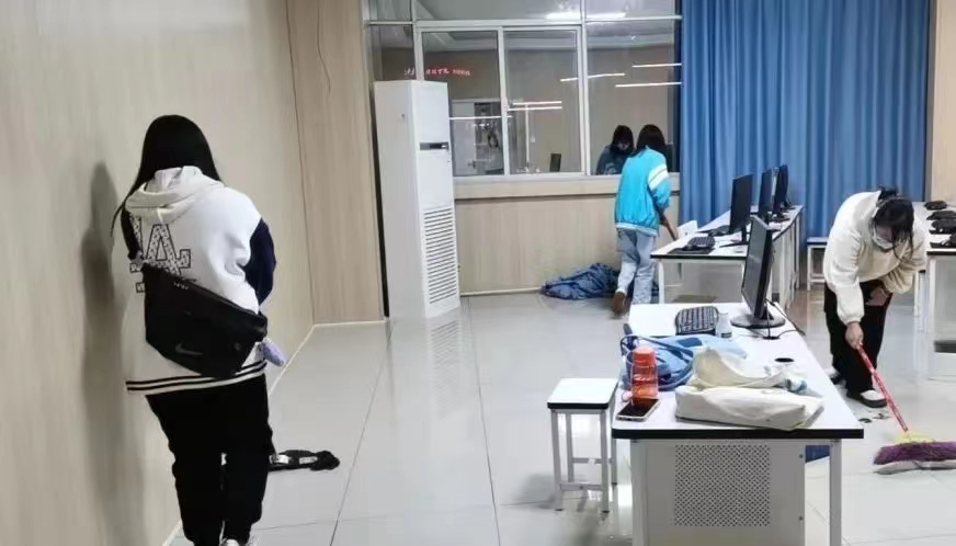 在辅导员老师的带领下,所有同学都带上了各自的打扫工具,并到达负责的区域进行准备工作。有的同学甚至刚到教室就迫不及待地开始了手头的打扫工作。