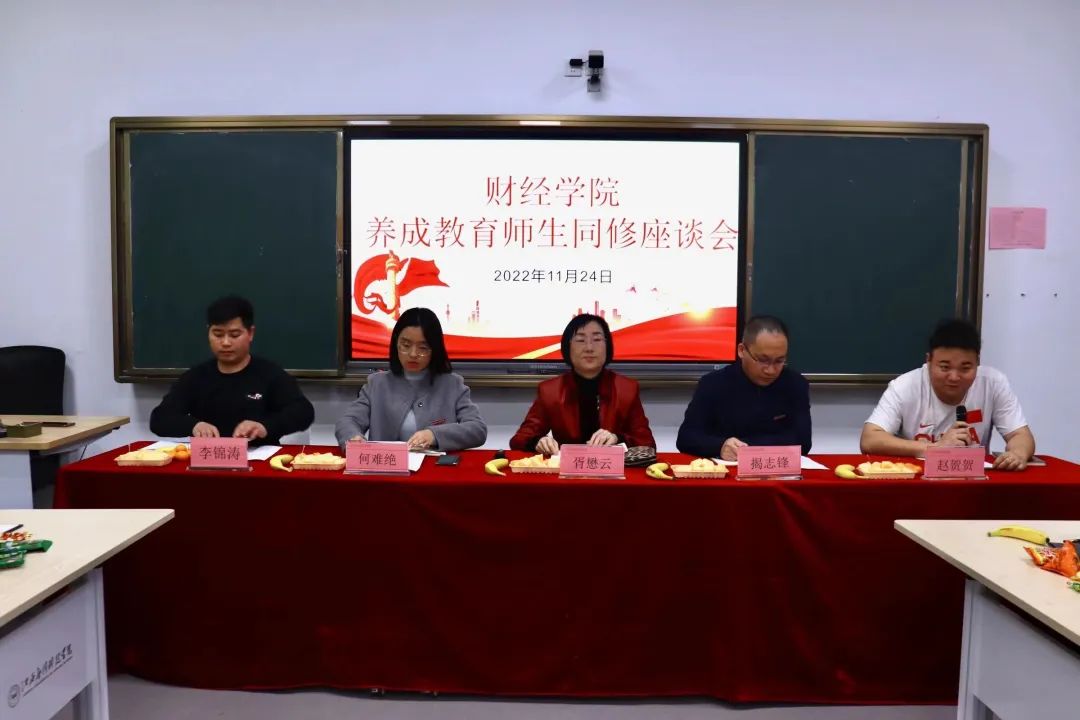 三、介绍与会者:出席本次座谈会的领导及嘉宾分别是校党委委员、副校长胥懋云、财经学院院长揭志锋、财经学院党总支书记何难绝、财经学院副院长匡文婷、财经学院学工科科长、专职辅导员、专任教师代表和各班级学生代表。