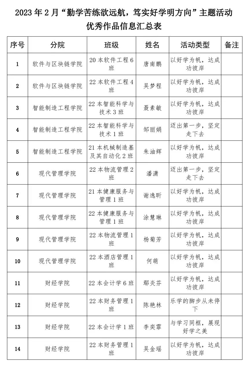 附件:2023 年 2 月“勤学苦练欲远航,笃实好学明方向”主题活动优秀作品信息汇总表