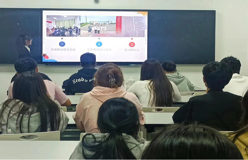 接下来,由大学生素质养成教育自治会工作人员唐若璇向大家养成教育的具体内容以及班级负责人需要做的相关工作。首先就是向大家说明养成教育成长手册填写要求,她重点强调养成教育成长手册的填写要规范。让每位学生在22个好习惯中选择3个本学期所需要培养的好习惯,并对此付出实践以及做好相关记录工作并且在成长手册上写下自己养成好习惯的过程以及心得。通过每学期3个好习惯的养成,让大家在大学生活中不管是学习上还是生活上都受益终身,全面提高大家的综合素质。同时,她还向大家介绍了在进行养成教育的相关活动,需要各班级负责人积极配合,确保每一次养成教育相关活动的顺利开展。