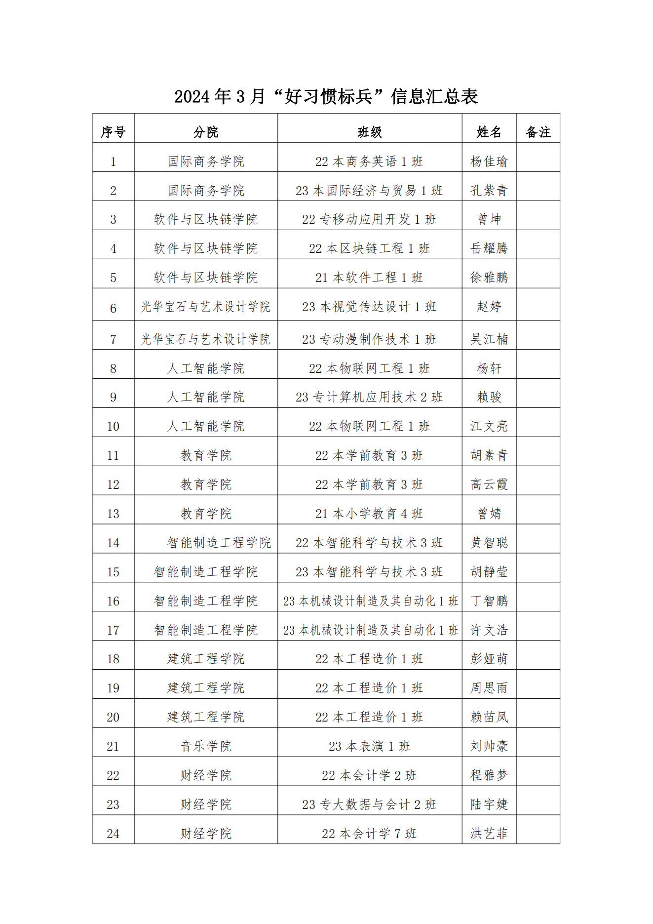 附件:2024 年3月份“好习惯标兵”信息汇总表