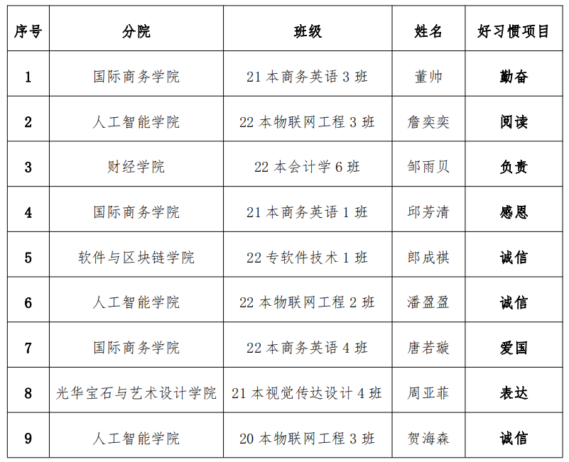 上一条:大学生素质养成教育 | 开展翻书“阅”岭,遇见美好阅读分享会活动 下一条:关于授予杨佳瑜等30名同学2024年3月“好习惯标兵”称号的决定