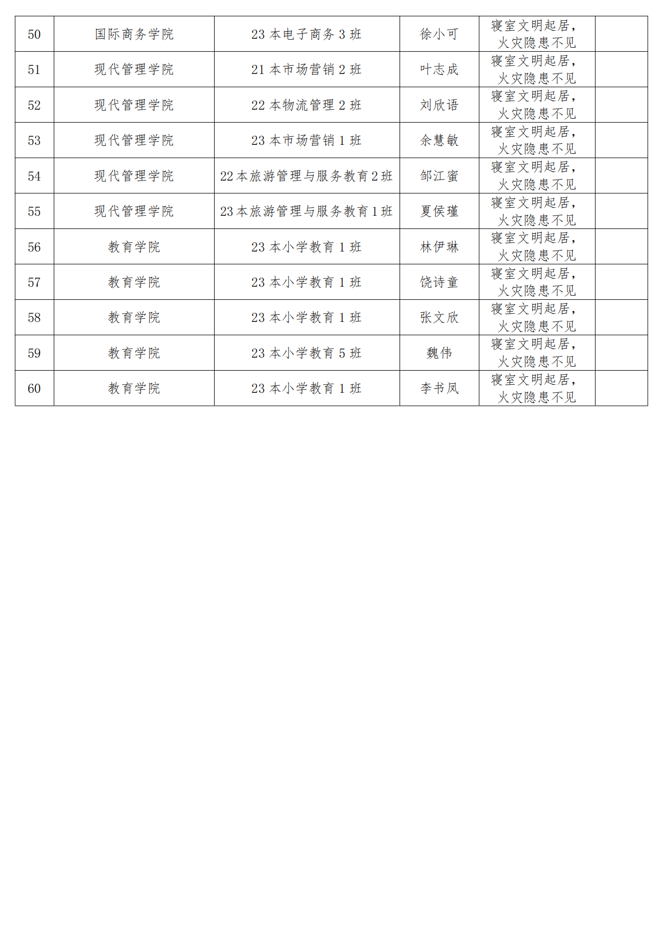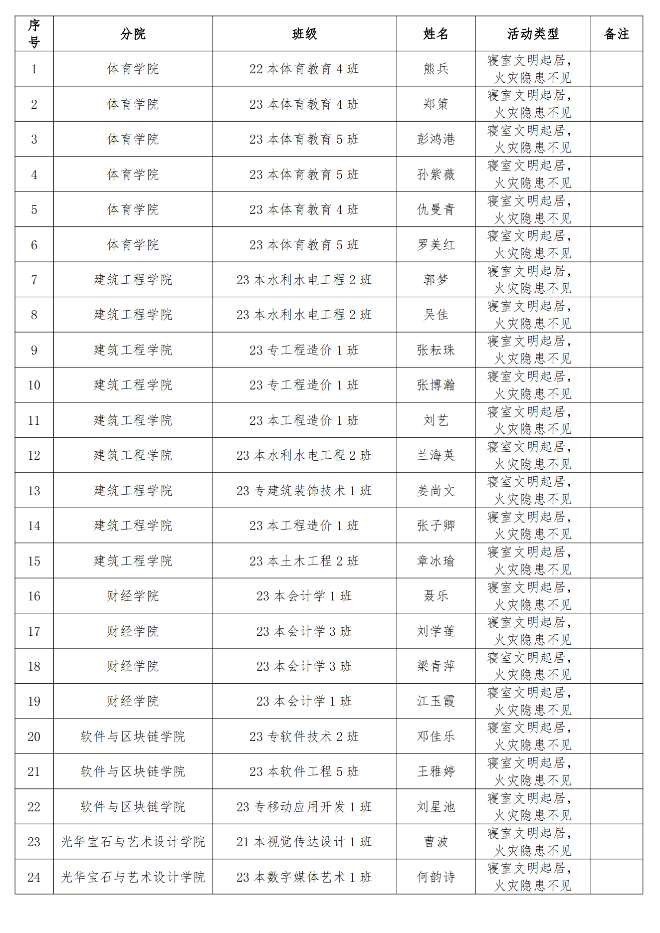 根据《关于开展72886必赢网站“寝室文明起居,火灾隐患不见”活动的通知》文件精神,经学生申请、学院推选、学校审核,拟确定熊兵等同学的60件作品为4月“寝室文明起居,火灾隐患不见”主题活动优秀作品,现将名单予以公示,公示期为3个工作日(公示时间:2024年5月6日-8日),公示期间如有异议,请通过电话的方式向学工(部)处反映,联系电话:0791-83659333。