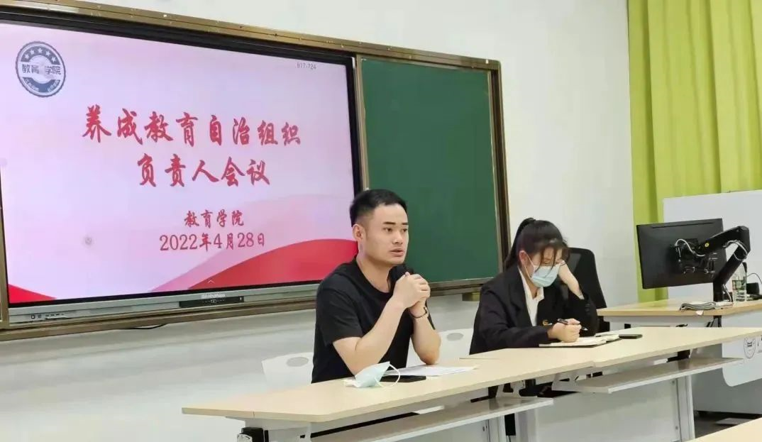 为推进我院“素质养成教育建设工程”的高质量发展,教育学院于4月28日在行知楼219召开了四月份“养成教育自治组织负责人会议”,学工科副科长张伟健就本月份各班养成教育的开展情况与各班养成教育负责人进行座谈。此次会议由教育学院养成教育自治组织负责人陈小雨主持。