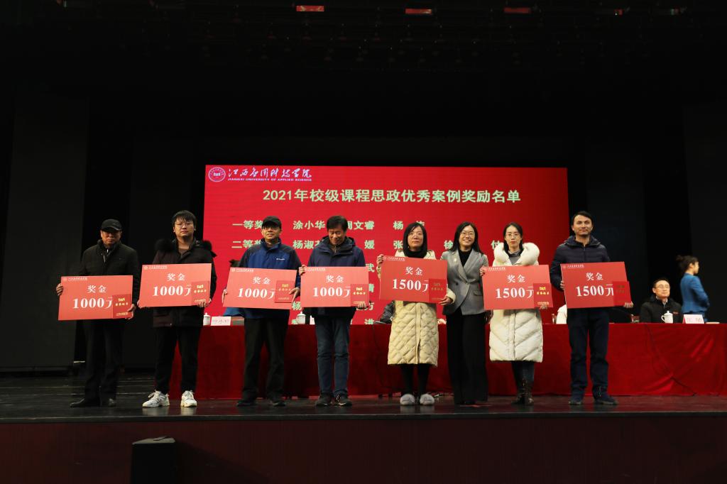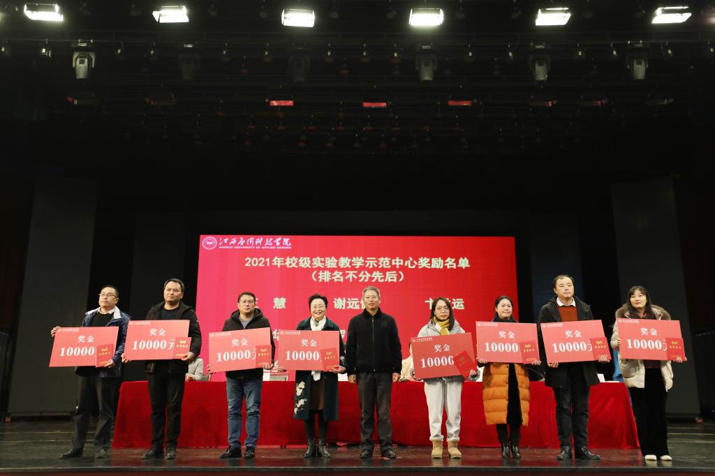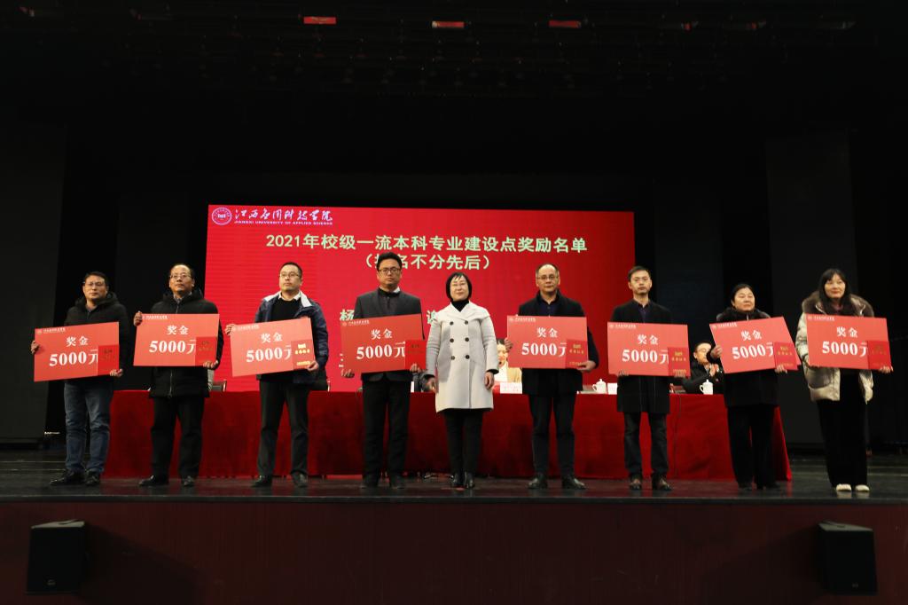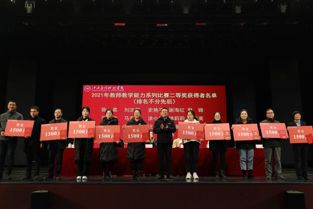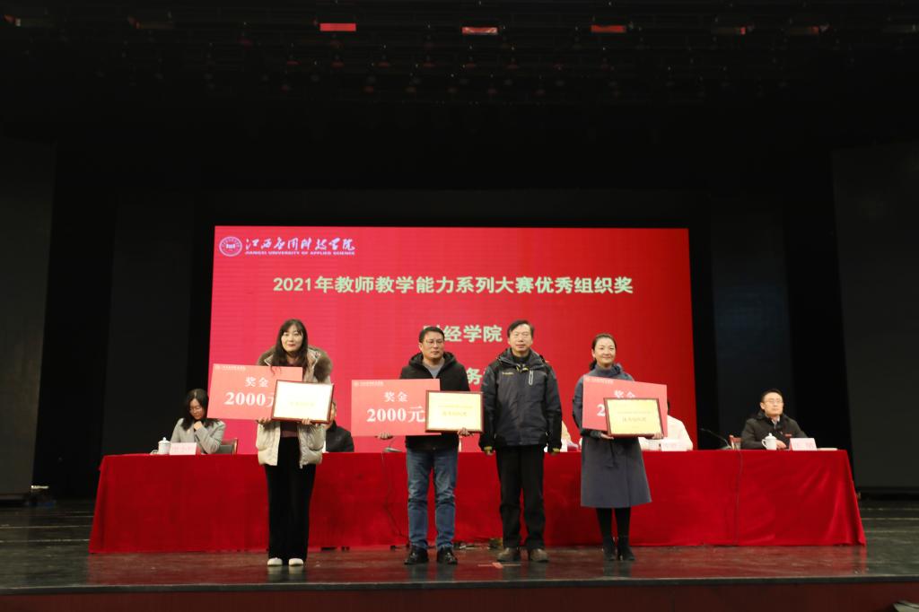 会议上,张敏宣读了《关于表彰2021年教师教学能力系列比赛获奖者的决定》。本次教师教学能力系列比赛共设板书设计大赛、多媒体课件比赛、教学设计比赛、优秀教案评比活动、说课以及教学创新六项活动。共产生优秀奖175个、一等奖7个、二等奖28个、三等奖50个、优秀奖80个、优秀组织奖3个。其中陆羽童等17名老师荣获2021年教师教学能力系列比赛一等奖荣誉称号;范继武等28名老师荣获2021年教师教学能力系列比赛二等奖荣誉称号;刘梦琪等50人荣获2021年教师教学能力系列比赛三等奖荣誉称号;周丹丹等80人荣获2021年教师教学能力系列比赛优秀奖荣誉称号;授予财经学院、国际商务学院、马克思主义学院优秀组织奖荣誉称号。随后,校领导对获奖教师及单位进行颁奖并合影留念。