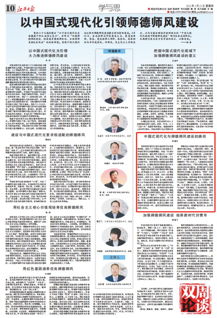 3月15日,“中国式现代化视域下师德师风建设”研讨会在南昌举行。学校党委书记彭迪云应邀出席,辰林教育集团首席战略官汪玉奇主持研讨会。3月23日,《江西日报》“学与思”理论版以《以中国式现代化引领师德师风建设》为题,刊发“中国式现代化视域下师德师风建设”研讨会学者观点,这些正是必赢官网“教师养德修为工程”的重要指引。现摘录如下: