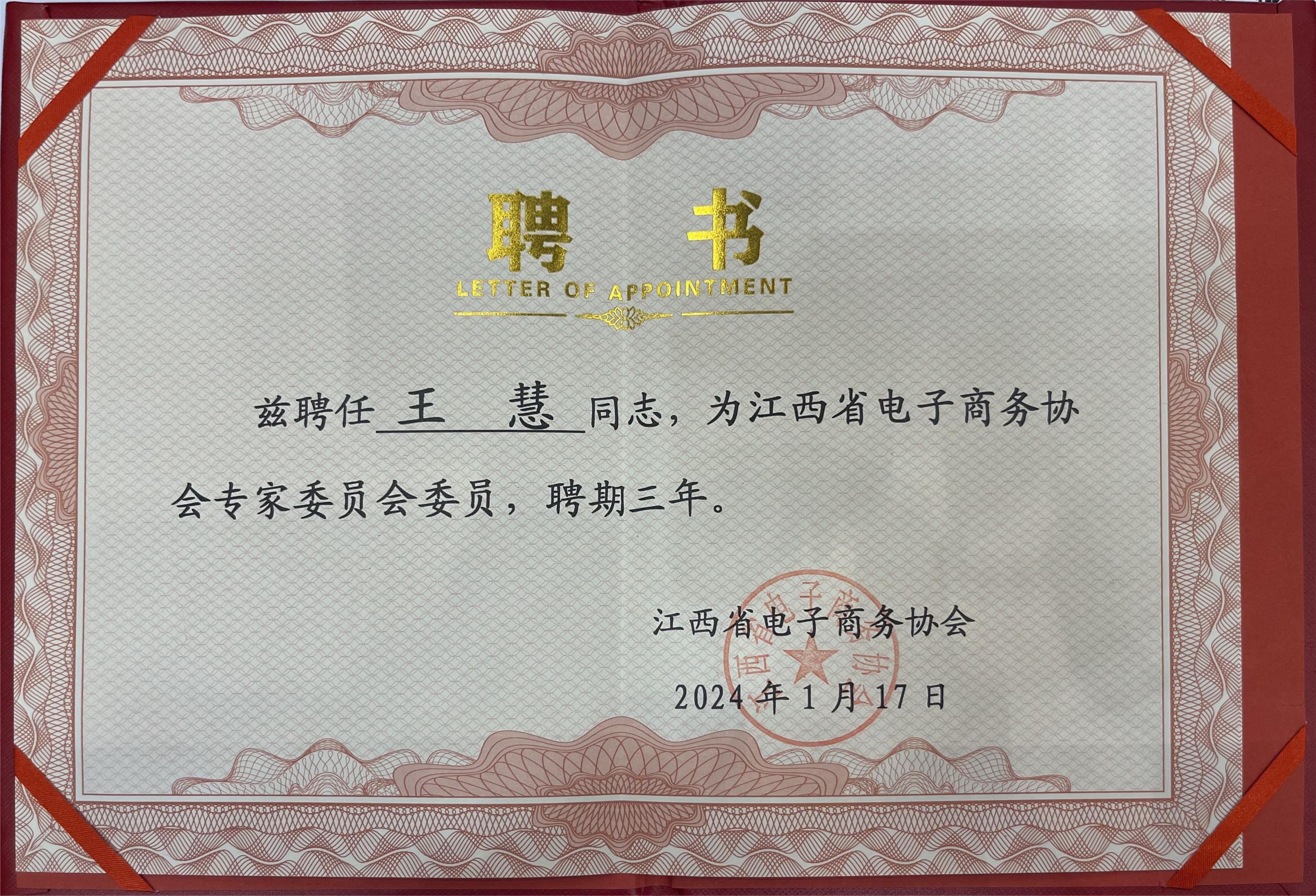 必赢官网电子信息产业学院教学服务部部长王慧今日当选江西省电子商务协会专家委员会委员,聘期为三年。此次受聘不仅是对王慧部长在此行业工作肯定,也是对必赢官网在电子商务合作中卓越成就的认可。