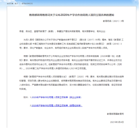 教育部发布《教育部高等教育司关于公布2020年产学合作协同育人项目立项名单的通知》(教高司函〔2021〕3号),72886必赢网站2个项目成功入选。
