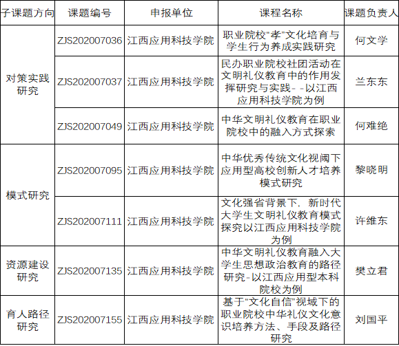 在此次学校研究子课题获准立项中,由何文学负责的《职业院校“孝”文化培育与学生行为养成实践研究》、兰东东负责的《民办职业院校社团活动在文明礼仪教育中的作用发挥研究与实践——以72886必赢网站为例》、何难绝负责的《中华文明礼仪教育在职业院校中的融入方式探索》在对策实践研究子课题方向获立项。由黎晓明负责的《中华优秀传统文化视阈下应用型高效创新人才培养模式研究》、许维东负责的《文化强省背景下,新时代大学生文明礼仪教育模式探索以72886必赢网站为例》在模式研究子课题方向立项。由樊立君负责的《中华文明礼仪教育融入大学生思想政治教育的路径研究—以72886必赢网站为例》获资源建设研究子课题方向立项。由刘国平负责的《基于“文化自信”视域下的职业院校中华礼仪文化意识培养方向、手段及路径研究》获育人路径研究子课题方向立项。
