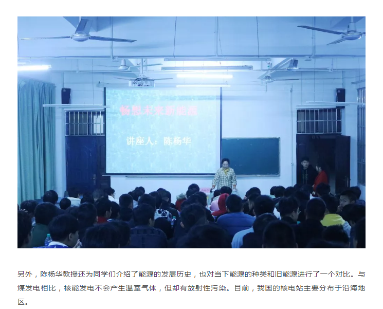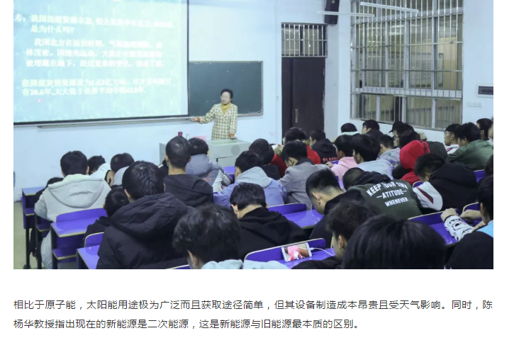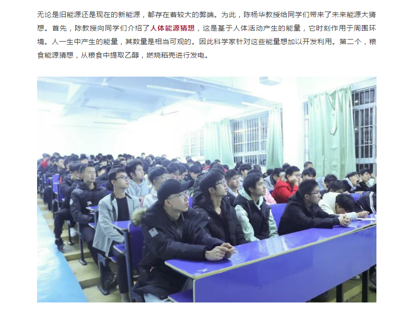 为加强同学们对能源的认知,更好的养成节约能源的习惯,加强能源与专业知识相结合的了解,12月17日晚上7点,智能制造工程学院于三达楼阶梯二教室开展主题为“畅想未来新能源”的专题讲座,主讲人为智能制造工程学院院长陈杨华教授。