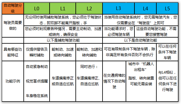 现阶段的智能驾驶技术都不是真正意义的自动驾驶,最多算是比较高级的“辅助驾驶”。参考目前国内官方依据SAE分级形成的智能网联汽车智能化等级标准,汽车的自动驾驶可分为6个级别。