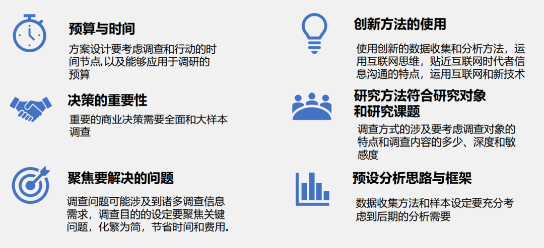 调查所覆盖的产品或服务类别、调查所覆盖的市场界限、适合调查对象、适合调查内容、考虑时间和成本