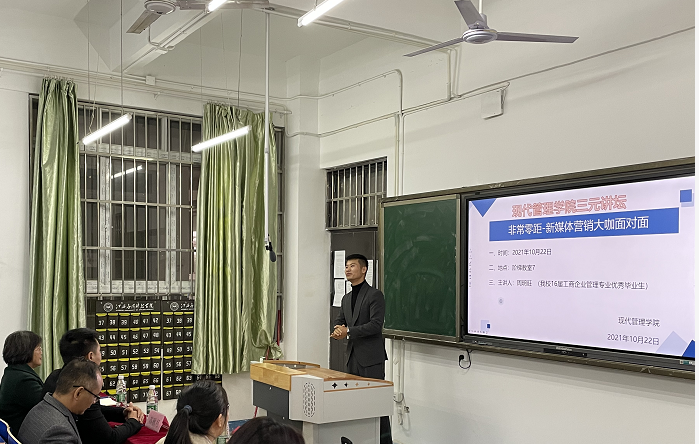 2021年10月27日下午,由现代管理学院主办的“非常零距离”访谈系列活动在三达楼阶梯七教室开展。此次活动有幸请到了16届工商企业管理专业优秀毕业生周明旺。周明旺现为江西橙光文化传媒公司负责人,主营短视频营销,个人IP成了江西上饶市广丰区本土短视频营销的头部“网红”。