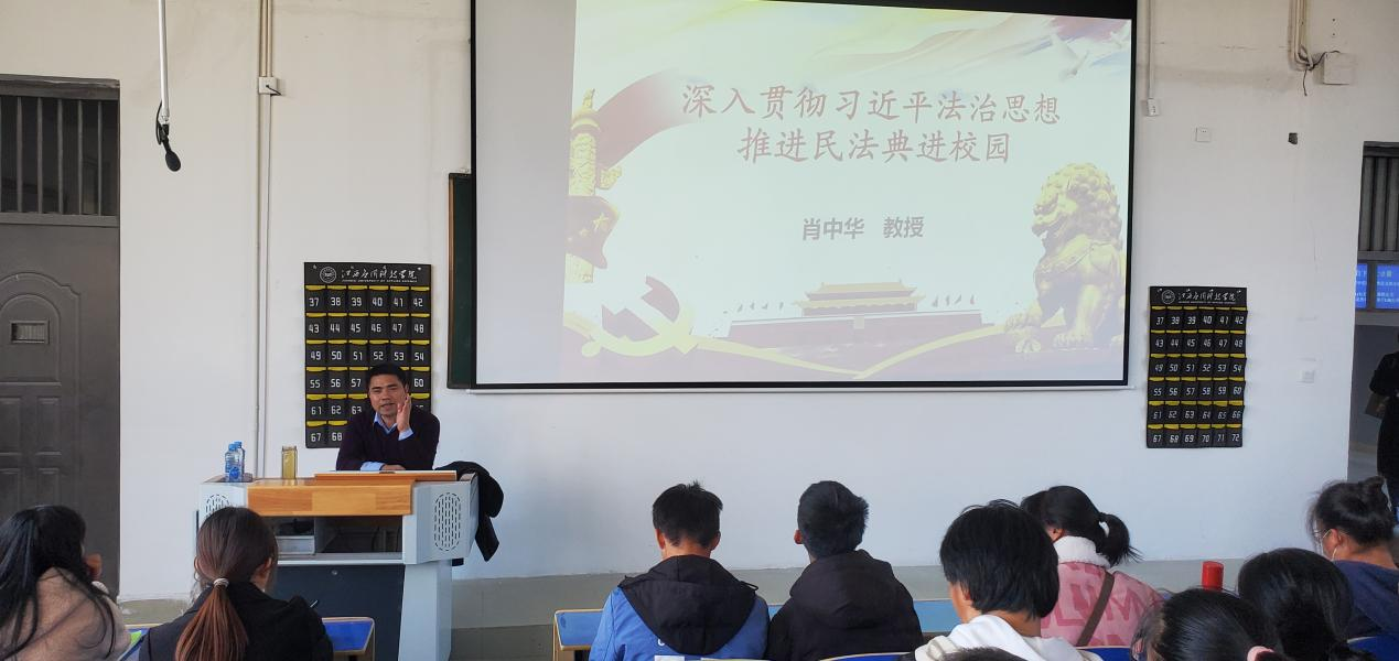 11月26日下午2:30,为深入学习贯彻习近平法治思想,把民法典纳入国民教育体系,加强对青少年民法典教育。必赢官网马克思主义学院邀请江西科技学院习近平新时代中国特色社会主义研究中心主任肖中华教授来校开展《深入贯彻习近平法治思想 推进民法典进校园》知识讲座。报告会由马克思主义学院专职教师胡连芝主持,二百多位学生代表到会学习。