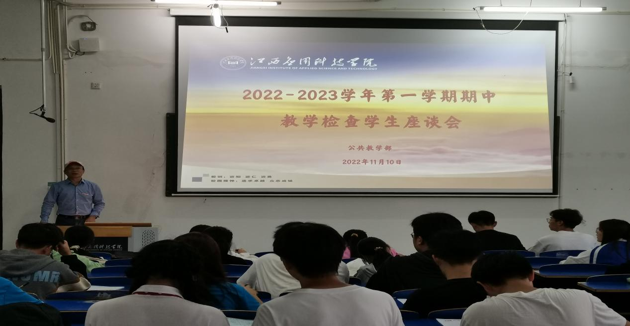 为了解教学部教学水平,改进教师教学方法和提高教学质量,根据《关于开展2022-2023学年第一学期期中教学检查的通知》(应科院教发〔2022〕174号)文件工作安排,公共教学部于2022年11月10日下午17:00在三达楼阶梯八教室召开了学生座谈会。教务科、全体任课教师班级信息员参加。本次会议由教学部主任魏斯民主持。