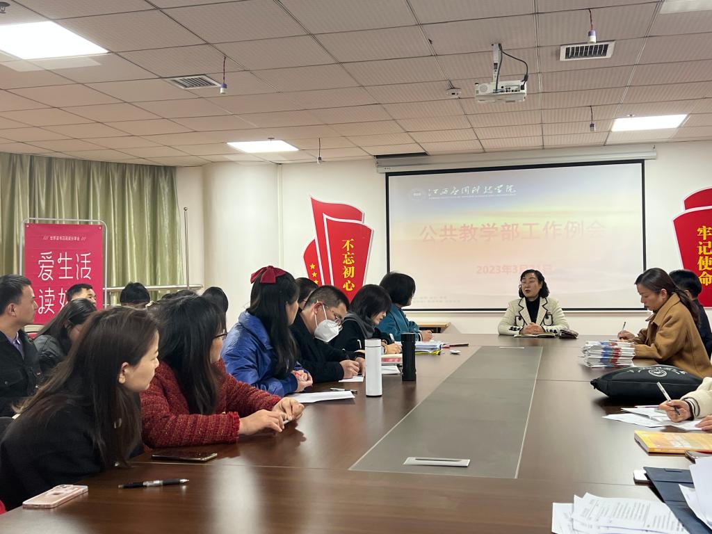 为全面做好2022-2023学年第二学期教学和评建工作,3月21日下午2点,公共教学部在综合楼305会议室召开教学部工作例会,党委委员兼副校长胥懋云莅临指导,公教部全体教职工参会。罗小丽副主任主持会议。
