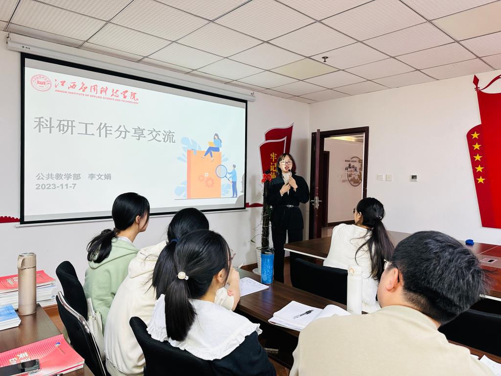 会上,数学教研室袁莉莉老师和实用英语教研室李文娟老师就近年来自己的科研工作进行了精彩的分享汇报。袁莉莉围绕“基于区块链的碳市场动力学模型”的研究背景及研究意义,国内外研究现状、研究思路与研究方法及已开展的相关工作进行分享。李文娟分享了自己对高校教师科研的重要性、对各类课题的申报要求及课题申报全过程的经验及理解,同时介绍了自己的科研情况。
