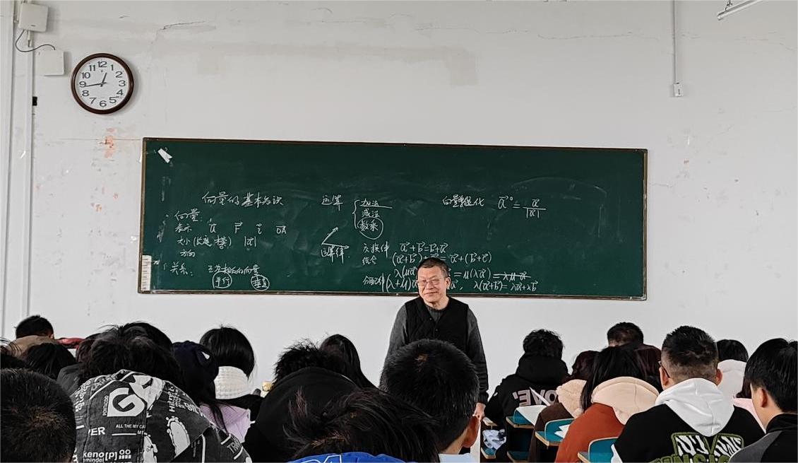课堂上,高老师从几何实例出发,结合课程思政、教学改革的育人目标,精心准备教学内容,注重学科之间的联系,讲练结合,生动直观地带领同学们学习向量等相关知识。整个教学过程采用启发式教学,注重数学思维的培养,积极与学生互动,引导学生踊跃参与课堂教学,激发学生的学习兴趣,收到了很好的教学效果。同学们在轻松愉悦的教学氛围中,自然而然掌握了教学内容且印象深刻。