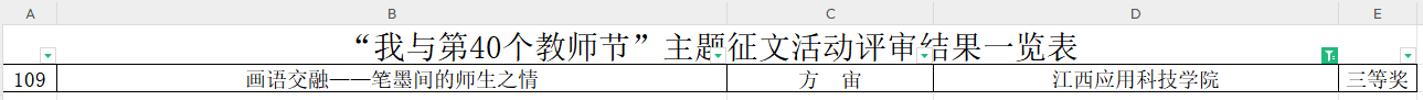 近日,江西省教育厅公布了“我与第40个教师节”主题征文比赛获奖名单,公共教学部大学语文教研室教师方宙凭借其优秀的征文作品《画语交融——笔墨间的师生之情》脱颖而出,荣获江西省“我与第40个教师节”主题征文比赛三等奖。