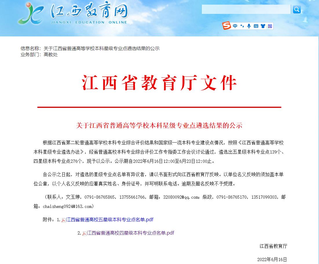据了解,此次评选结果是根据江西省第二轮普通高等学校本科专业综合评价结果和国家级一流本科专业建设点情况,按照《江西省普通高等学校本科星级专业遴选办法》,经省普通高校本科专业综合评价工作专指委工作会议讨论通过,遴选出五星级本科专业点139个、四星级本科专业点276个。