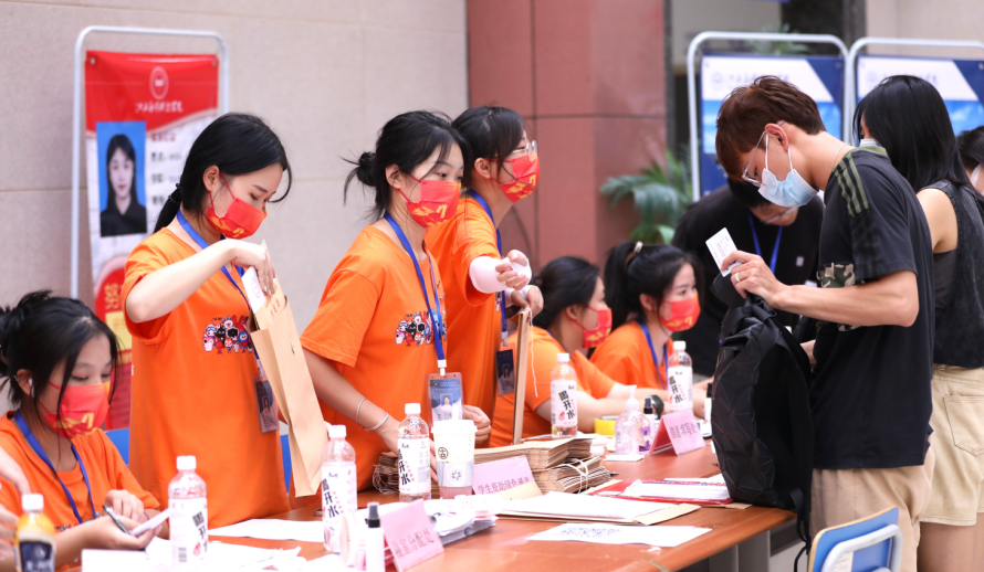 图书馆一楼的报到大厅内,各分院报到处前人头攒动,新生接待工作有序地进行。各部门的工作人员和来自各个学院的志愿者在各自的岗位上忙碌着,为新生答疑解惑,提供贴心的指引。信息审核、办理入学手续、报到确认、领取生活用品、入住宿舍等环节井然有序。