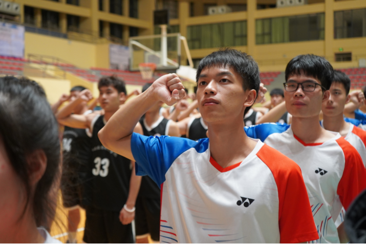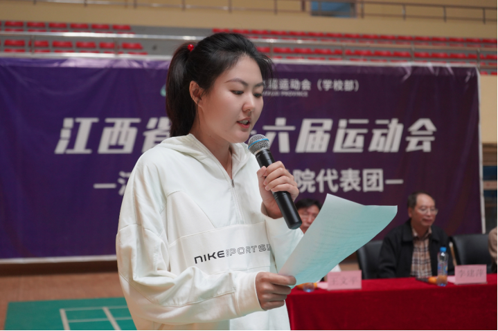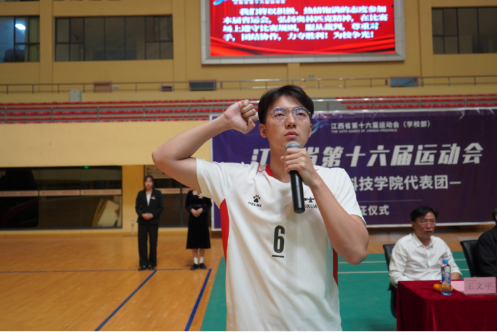 随后,运动员代表赵晨文带领全体运动员进行庄严宣誓。各项目运动员身着队服,目光坚定,精神饱满,庄严宣誓,表达为省运会增添色彩、为校争光,不懈奋斗、勇争第一的决心。