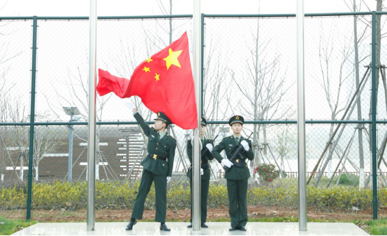 晨露未晞,在清晨第一束阳光的映照下,学校教官队迈着整齐铿锵的步伐,师生齐唱国歌,行注目礼,鲜艳的五星红旗冉冉升起,高高飘扬。