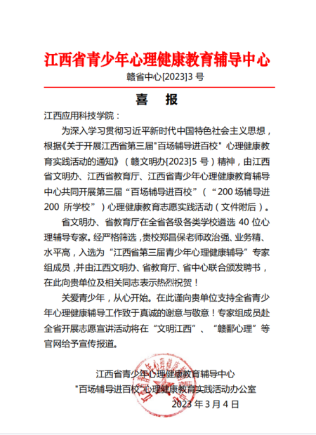 近日,在江西省文明办、江西省教育厅、江西省青少年心理健康教育辅导中心共同开展的江西省“百场辅导进百校”心理健康教育志愿实践活动中,必赢官网郑昌保老师成功入选为“江西省第三届青少年心理健康辅导”专家组成员。
