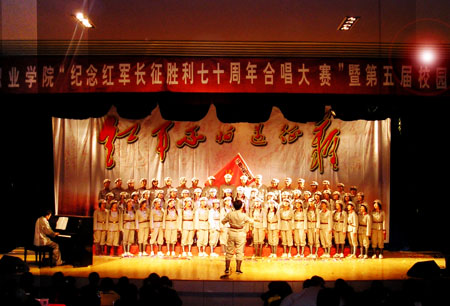 为重温红军艰苦卓绝的光荣历程,弘扬伟大的长征精神,11月29日晚7:00,由院团委学生会主办的“纪念红军长征七十周年合唱大赛暨第五届校园合唱节”在图书馆12楼演播大厅隆重举行。