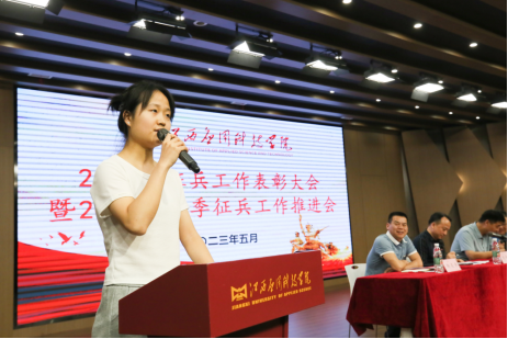 学生代表陶思怡同学说,报效祖国,巩固国防,需要我们胸怀报国之志的大学生投身军营、建功立业,作为一名应科人,他定会责无旁贷、义无反顾地担当起历史重任,不负学校和老师的希望和嘱托。