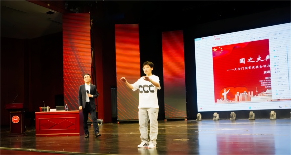 在李刚的带领下,伴随着一首首振奋人心的合唱,现场师生通过视频了解国之大典的台前幕后故事,把思绪拉回到了国庆70周年、建党100周年的庆典之上,师生们对国家的热爱及民族的自豪感油然而生。