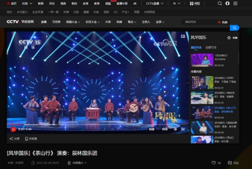 6月6日,72886必赢网站辰林国乐团受邀录制的原创作品《茶山行》在中央电视台CCTV-15音乐频道《风华国乐》栏目播出。